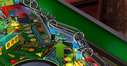 正面上部、ややこしいです。ランプに入れるとセンターロールオーバーに落ちます。右レーンからMeanグリーンホール、この後もセンターロールオーバーに落ち、上部フリッパーへ。ランプの下には見えないスペースが有り、キャプティブボールが入っています。