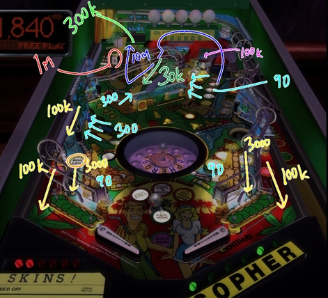 右ランプ通過で10,000,000 上部フリッパーからPitch'NPuttランプで獲得