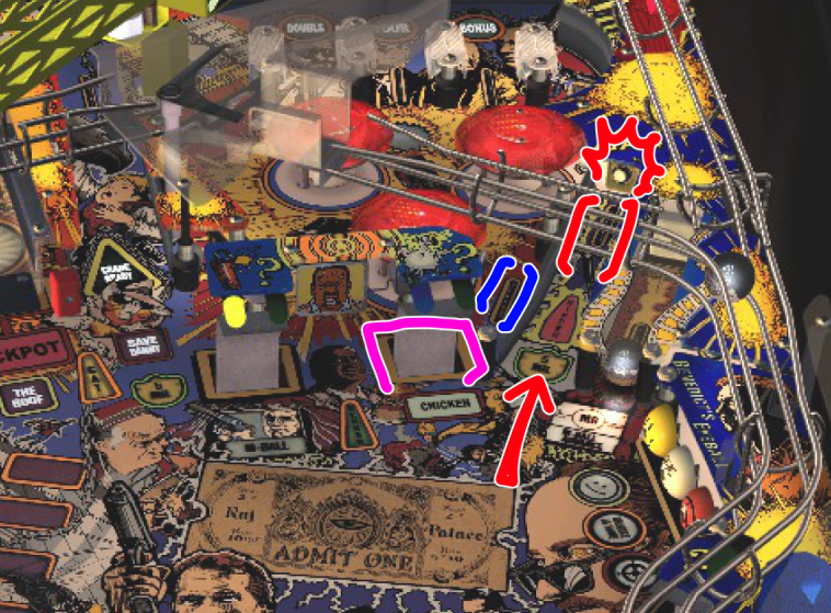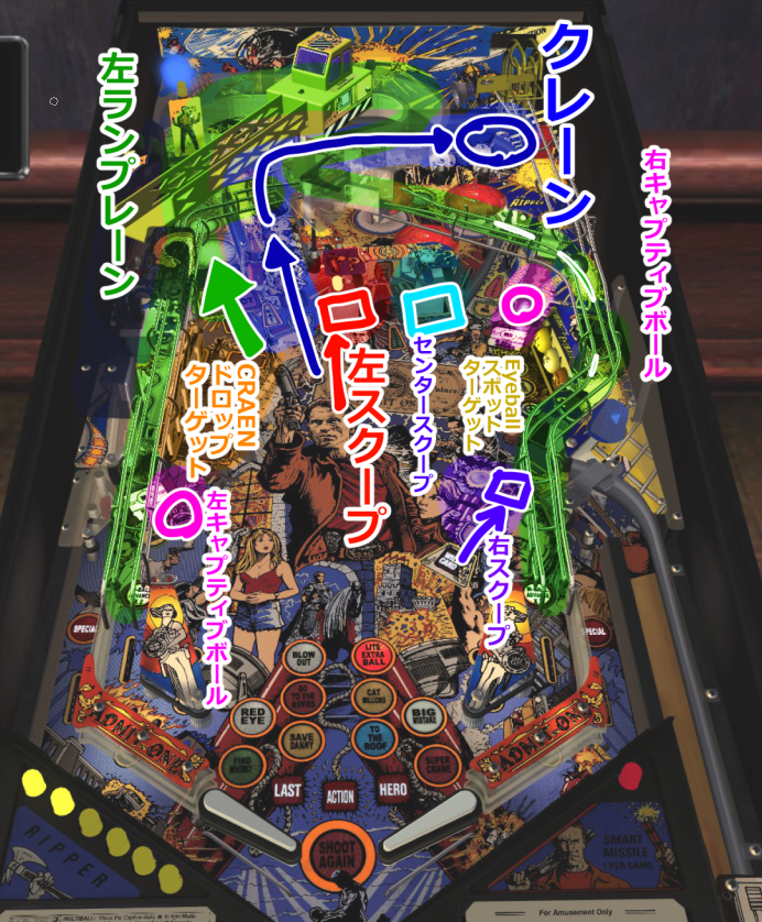動くクレーン、マルチボールで邪魔する磁石装置(アダムズ・ファミリーのあれ)、強烈跳ね返しリッパーレーン!